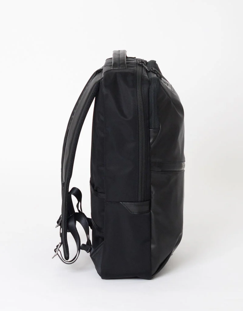 master-piece( マスターピース)のProgress-sc(プログレス エスシー)シリーズの2WAYバッグ。本体素材に環境に優しいポリウレタンをコーティングを施した600d ポリエステル生地を使用し、絶妙な光沢感を持たせながらゴムライクな質感とマットな素材感が特徴です。生地の裏面にはPVCコーティングが施され、防水性とハリ感を実現しています。内装の生地には抗菌・防臭効果のある 420d のナイロン生地を使用し、臭いの原因となる黄色ブドウ状球菌の繁殖を制御するため、その分泌物から発生する悪臭を防止します。バックパック、ブリーフケースと2通りでの使用が可能な2WAYタイプです。