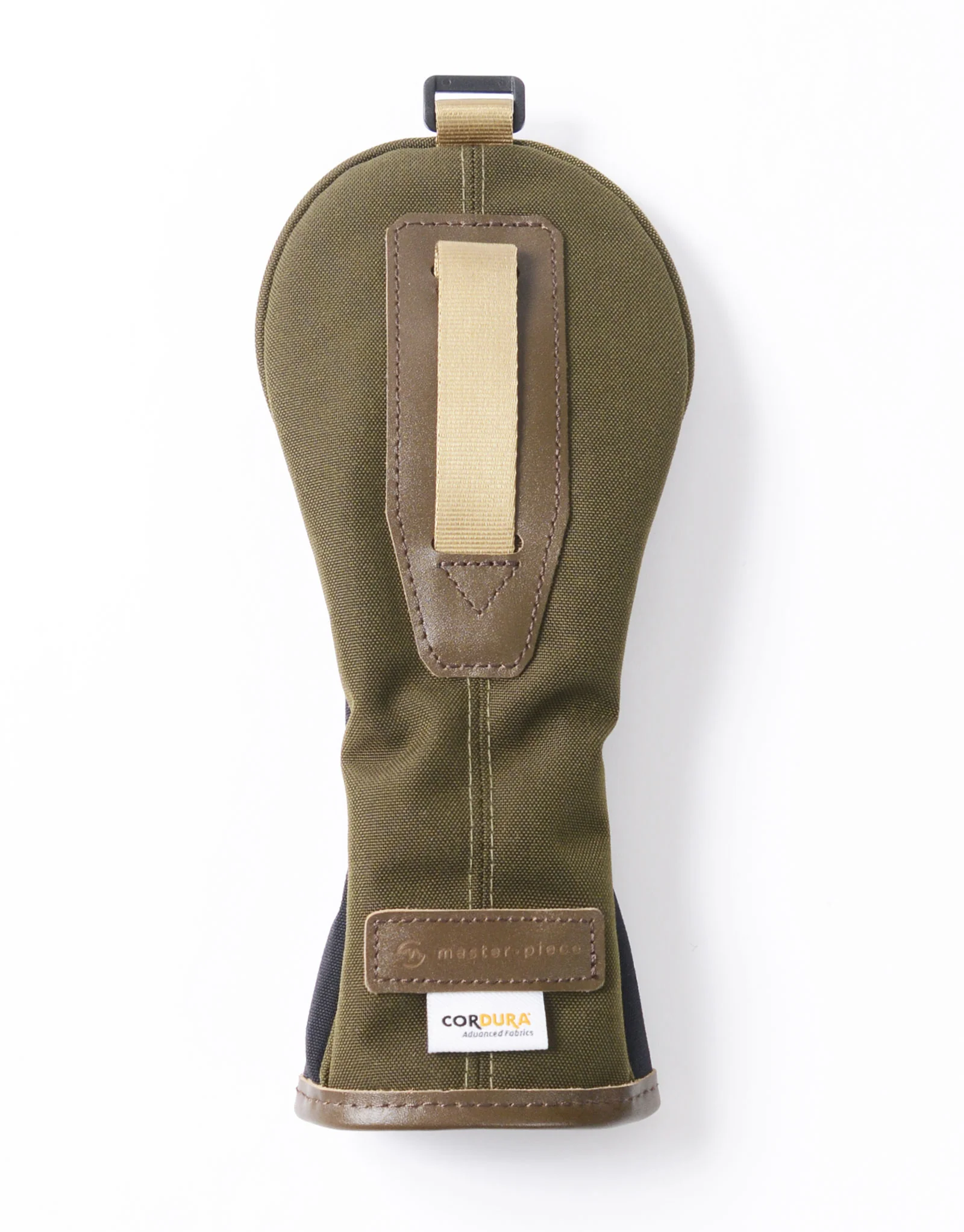 master-piece( マスターピース)master-piece GOLFシリーズのヘッドカバー for UT。本体素材は CORDURA® brand fabric の生産、品質基準を満たした認定工場において、210d の 66 ナイロン糸を 2 本撚りしたものを、2 本引き揃え、タテ・ヨコに使用し織り上げた、耐久堅牢度に 優れたオリジナルファブリック、MASTERTEX-07 になります。生地の表面には撥水加工、裏面には特殊透湿防水フィルム L-Vent® をラミネート加工し、トリコットナイロンを貼り合わせた3 レイヤー 構造による耐水圧 20,000mm レベルの防水機能を備えております。またパーツにより、オリジナルファブリックである MASTERTEX-04、05、06 を組み合わせています。 付属素材もレザーは防水鞣しを施したレザーを使用、底面の素材は、通常ナイロン の約 5 倍の摩耗・引き裂き強度・耐久性を持つ INVISTA 社の 1680D コーデュラバリステック ® ナイ ロンを使用し、裏面に PVC 加工を 施すことで更なる強度と防水性を向上させています。master-piece のフラッグシップシリーズ potential を GOLF で使えるギアとしてアップデートしました。