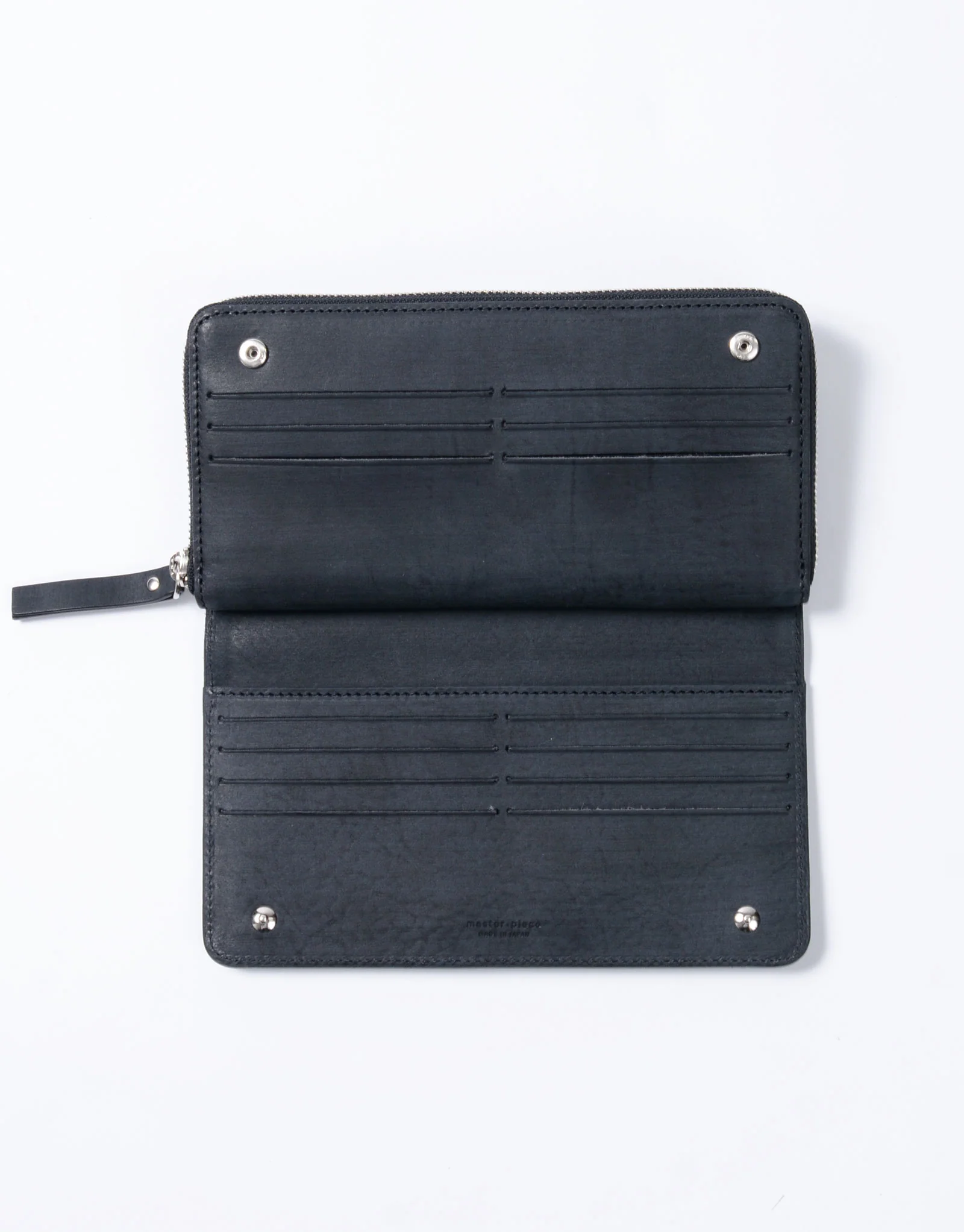 職人の手で1 枚1 枚カナブラシを用いてブラッシングをかけられた木目調の表情の革と、ネーム部分のカシメが特徴的なカジュアルウォレットシリーズ。