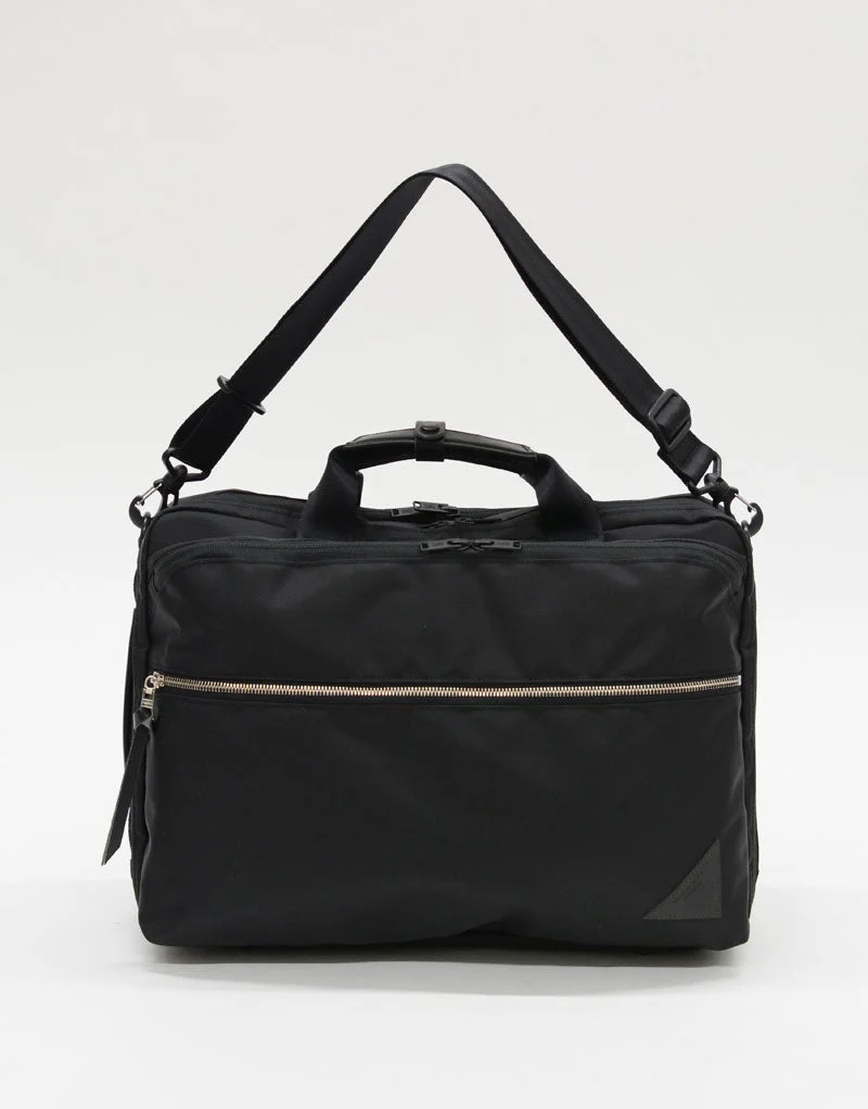 本体生地に東レの先端テクノロジーから生まれた超高強力ナイロン織物「鎧布®」を使用しています。従来の66ナイロンとは異なり紡績の高粘度ポリマー技術と紡糸技術により、世界最高水準の 高強力ナイロン糸を使用した織物になっております。さらに今までの66ナイロンより強靭で耐久性に富んだ、純国産の技術を結集した素材を使用しています。この鎧布®420dナイロンに表面には、 耐久性のある超撥水加工を施し、裏面には異なる三層のコーティングをすることにより軽量かつ防水性も高めています。付属生地は、通常ナイロンの約5倍の摩耗・引き裂き強度・耐久性を持つ INVISTA社の1680dコーデュラバリステック®ナイロンを使用し、裏面にPVC加工を施すことで更なる強度と防水性を向上させています。また付属レザーには日本皮革技術協会の13種の基準が ある有害物質検査(JES)済みで人体に有害な物質・六価クロムを、一切使用せずベジタブルタンニンで鞣されたエコヌメカウレザーを使用しています。フロントポケットのファスナーはエレメントひと つひとつの全面に入念な磨きをかけたYKK社製EXCELLAを使用する他にパーツ類は極力、金属を使用しないことで軽量化を図っています。三角形のネームは再帰反射機能があり夜間の安全性 にも考慮しました。ラップトップやタブレット等を収納するスペースを設けています。シンプルなデザインやカラーでオン・オフ問わず、様々なシチュエーションに対応するシリーズです。