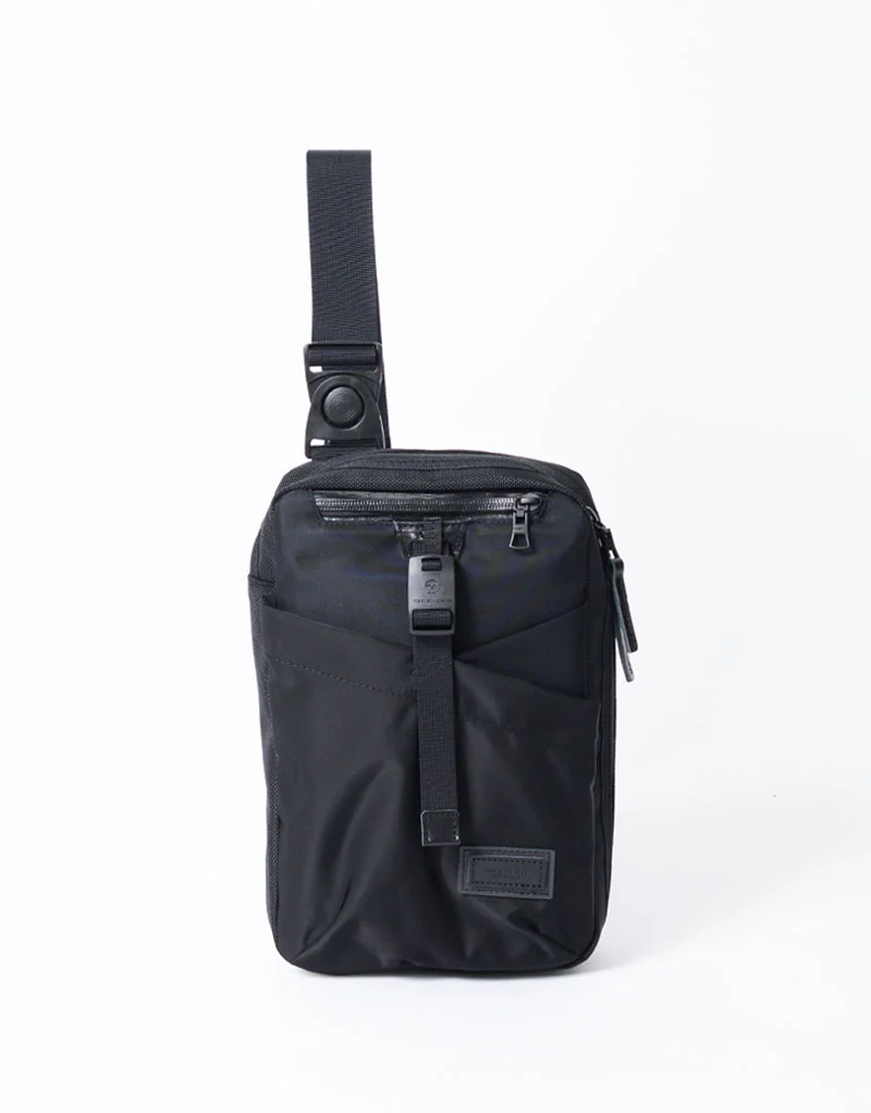 強靭性の高いナイロンと、程よい光沢感のナイロンツイル、再帰反射機能を持たせたレザーネーム、異素材で組み合わされたフロントポケットが特徴的なアイテム。